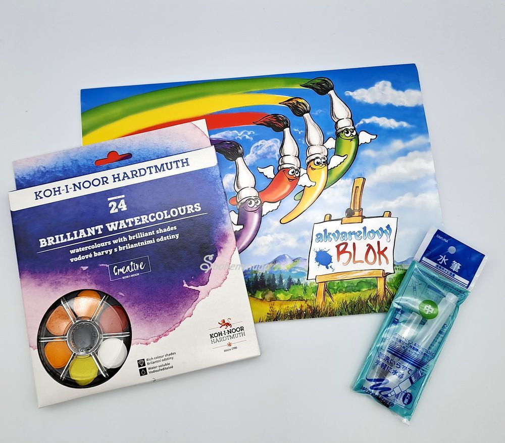 Set obsahuje brilantní vodové barvy (dříve nazývané Anilinky), akvarelový blok a plnitelný štětec.