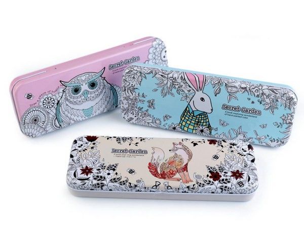 Kovový dvoupatrový penál 8x21 cm s potiskem inspirovaným omalovánkami.